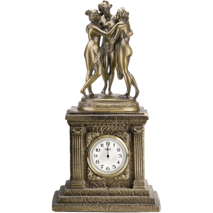 Изделие производится из высококачественного коелгинского мрамора, который привозится в виде мраморной крошки, затем отливается вручную и подвергается дополнительной обработке — патинированию и золочению поталью. Капсула часов немецкого производства – вставляется в скульптуру. Часы работают от одной батарейки маркировки GP 910A – BC, RL – 1, напряжение 1.5В (входит в комплект). Вес изделия, 10.8 кг.