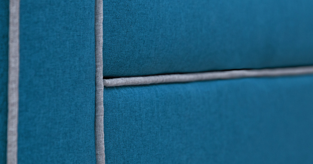 Декоративный контрастный кант по торцу спинки, торцу подлокотника, по верхнему срезу царги. Утяжки с пуговицами на спинке дивана. Две декоративные подушки в контрастной ткани.
