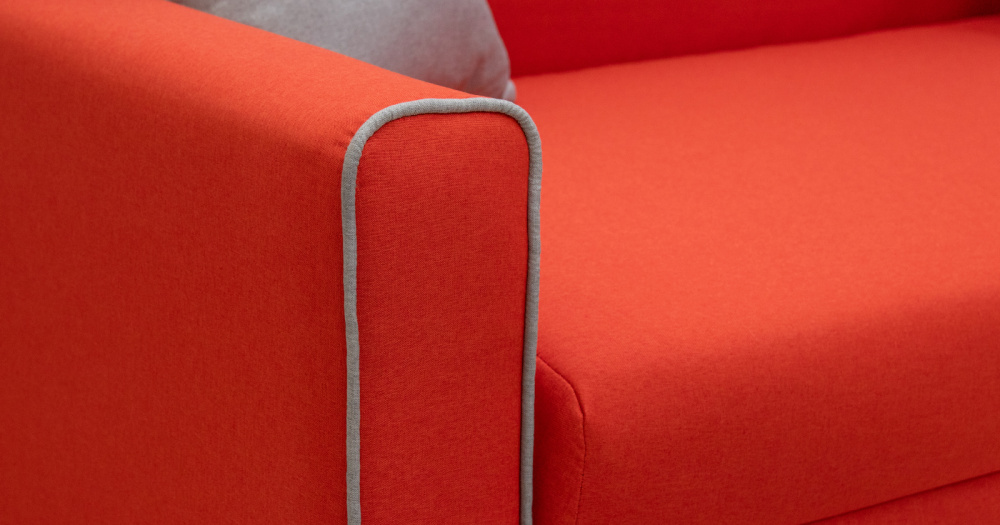Декоративный контрастный кант по торцу спинки, торцу подлокотника, по верхнему срезу царги. Утяжки с пуговицами на спинке дивана. Две декоративные подушки в контрастной ткани.