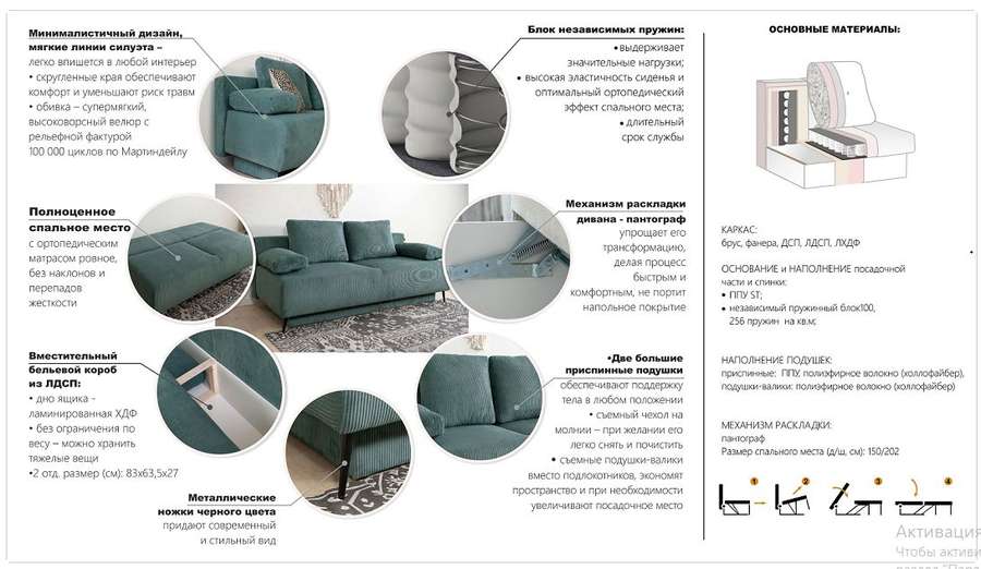 Диван «Альба» выполнен в стиле минимализма, где каждый его элемент наполнен функциональностью: от мягких, плавно округленных линий до удобных приспинных подушек и съемных валиков. Высокие металлические ножки добавляют легкости визуальному образу, в то время как рельефная велюровая обивка придает мягкости и облегчает уход. Механизм "Пантограф" делает процесс раскладки быстрым и комфортным, сберегает напольное покрытие даже при ежедневном использовании. Спальное место с ортопедическим матрасом на независимом пружинном блоке гарантирует полноценный сон ночью и комфортный отдых.