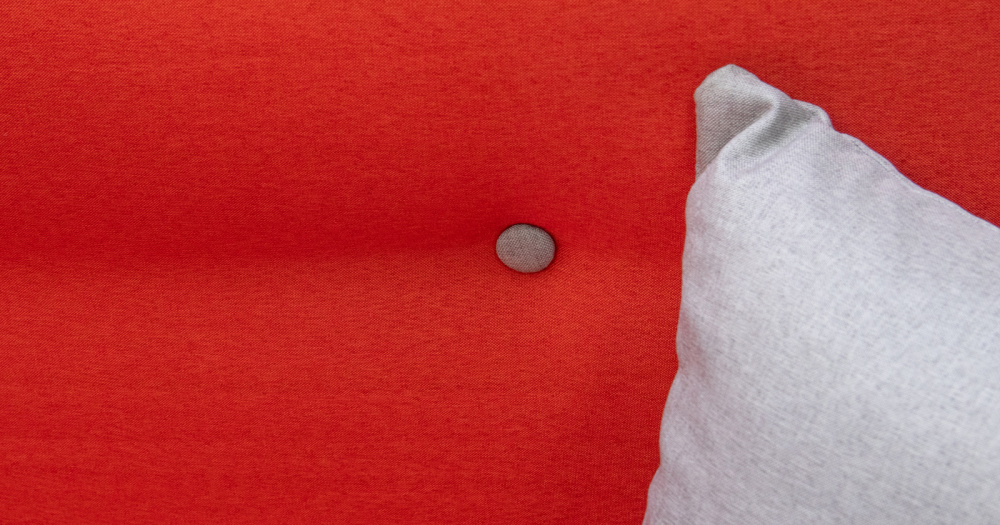 Декоративный контрастный кант по торцу спинки, торцу подлокотника, по верхнему срезу царги. Утяжки с пуговицами на спинке дивана. Две декоративные подушки в контрастной ткани.