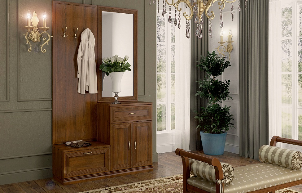Компактная и функциональная, Композиция №3, очаровательна в своей строгой элегантности и традиционности. В ней есть все, что необходимо – небольшое аккуратное зеркало, две тумбы для обуви и панель-вешалка. Эта композиция идеально подойдет для небольших прихожих.