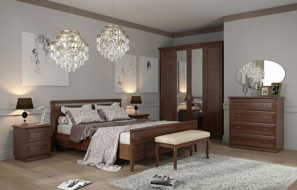 Грациозная и лаконичная, Композиция №1, благодаря высокому статному шкафу с зеркальной вставкой, кровати с резным изголовьем, смотрится необыкновенно торжественно и элегантно. Изысканности добавляет изящная банкетка на изогнутых буковых ножках, которая идеально подойдет к туалетному столику, либо к изножью кровати и будет нарядным украшением Вашей спальни.