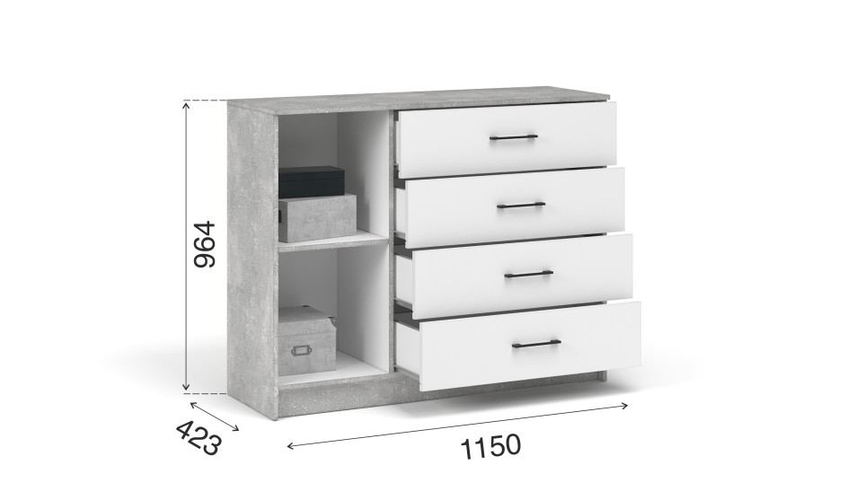 Комод Чикаго, выполненный в нейтральных цветах с черными матовыми ручками, хорошо сочетается с разными стилями интерьера и позволяет добавить яркие и насыщенные оттенки, полностью преображая пространство. Он укомплектован вместительными полками и выдвижными ящиками на роликовых направляющих для хранения вещей по категориям. Идеально компонуется со всеми модулями системы Чикаго.