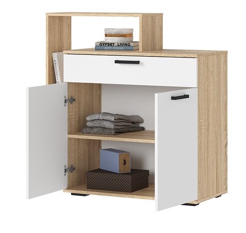 Комод КМ 01 Санса - это компактный и стильный элемент хранения, идеально подходящий для гостиной, спальни или прихожей. Модель оснащена двумя распашными дверцами, вместительным ящиком и открытыми боковыми секциями для книг, декора или мелочей. Лаконичный дизайн с контрастом белых фасадов и светлой древесной текстуры делает комод универсальным решением для современного интерьера.