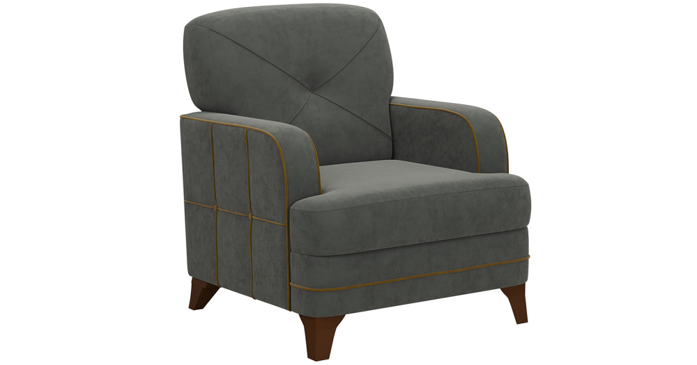 Декоративные канты на вставке подлокотников. Пуговицы в местах пересечения кантов на подушке и вставке подлокотников. По торцам подлокотников и думках контрастный декоративный кант. Защипы на сиденье и подушке.