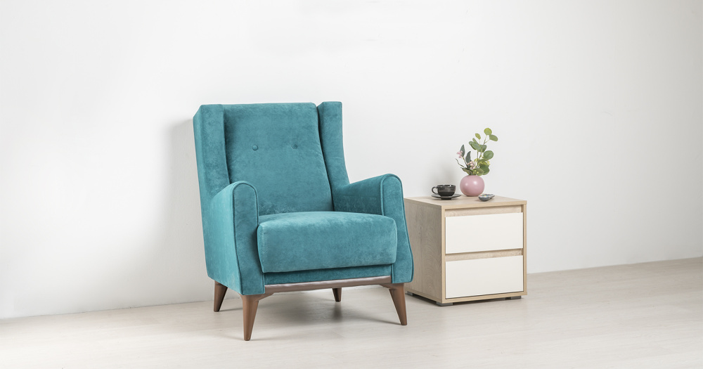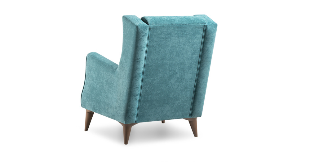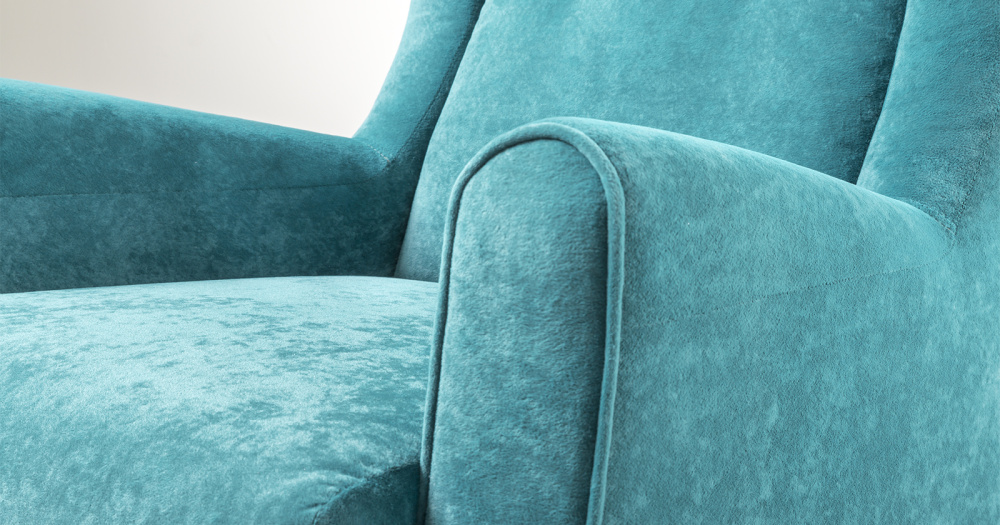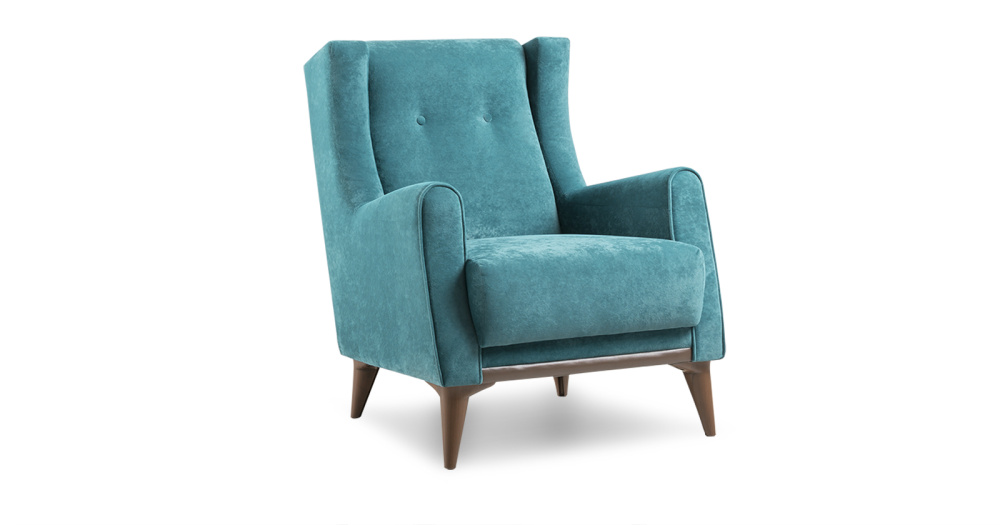 Декоративный кант из основной ткани по переднему торцу подлокотника; Утяжка спинки на 2 декоративные пуговицы из основного материала; Декоративный элемент царги из материала-компаньона.