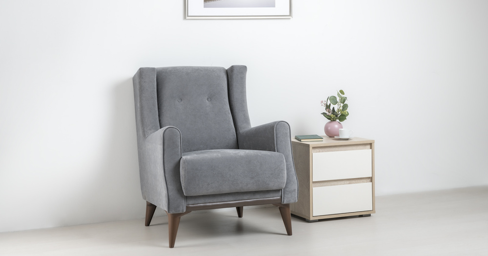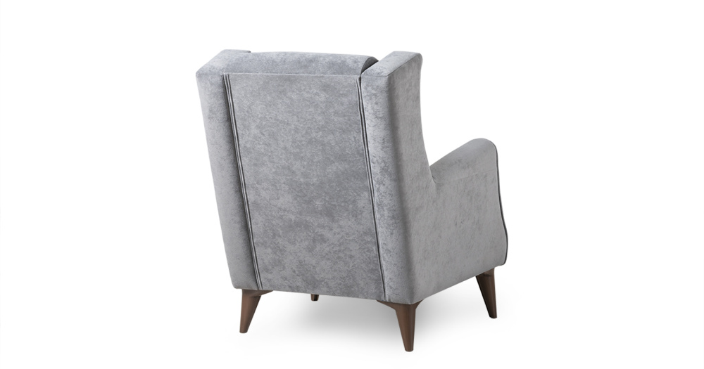 Декоративный кант из основной ткани по переднему торцу подлокотника; Утяжка спинки на 2 декоративные пуговицы из основного материала; Декоративный элемент царги из материала-компаньона.