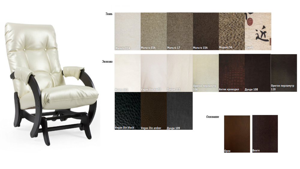 Шикарное кресло-качалка с маятниковым механизмом. Каркас изготовлен из дерева на высокотехнологичном оборудовании и выдерживает нагрузку до 150 кг. Конструкция кресла придает ему особую устойчивость – оно никогда не сдвинется с места при раскачивании, в отличие от простых кресел-качалок. Эргономичная форма сиденья и спинки, удобные мягкие подголовник и подлокотники делают гляйдер очень комфортным. Высококачественная экокожа, которая использована в обивке кресла делает его легким в уходе. Кресло-гляйдер прекрасно подходит для любого, даже самого изысканного интерьера.