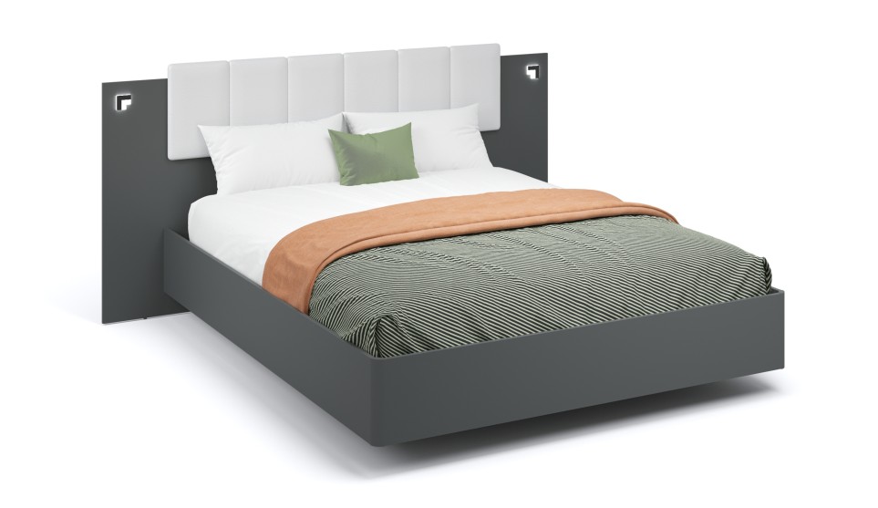 «Мишель» – это современная кровать в актуальных природных цветах с оригинальной конструкцией основания, которое в сочетании с подсветкой создает «эффект парения». Накладные светильники в комбинированном изголовье и подсветка по его периметру дают дополнительное освещение в ночное время, а мягкая накладка с вертикальной отстрочкой комфортно поддерживает спину во время отдыха.