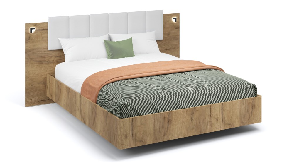 «Мишель» – это современная кровать в актуальных природных цветах с оригинальной конструкцией основания, которое в сочетании с подсветкой создает «эффект парения». Накладные светильники в комбинированном изголовье и подсветка по его периметру дают дополнительное освещение в ночное время, а мягкая накладка с вертикальной отстрочкой комфортно поддерживает спину во время отдыха.