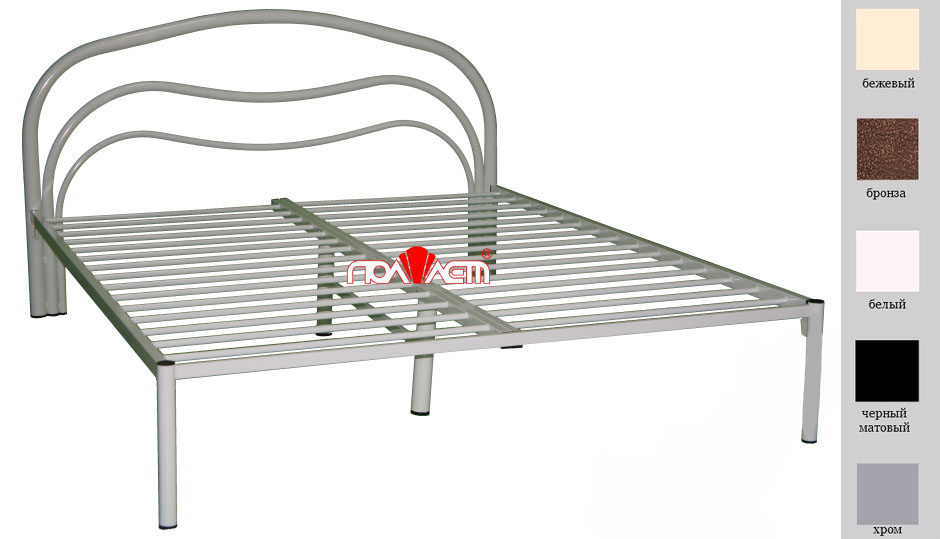 Кровать состоит из каркаса, включающего цельносварную опорную спинку, наружный контур которой образован гнутыми деталями разных форм и размеров, и основания, которое крепится к спинкам посредством четырех клиновых соединений. Основание состоит из продольных металлических реек и перемычек, шаг расположения которых, согласуется с шагом пружин матраца на зависимом пружинном блоке.