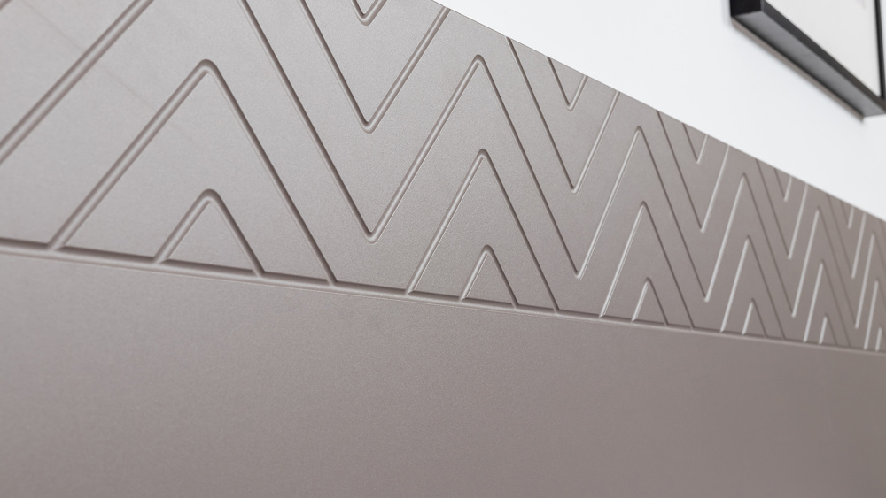 • Подвесные консоли и велюровый пуф в тон фасадов дополняют сдержанный и благородный облик спальни Амьен.