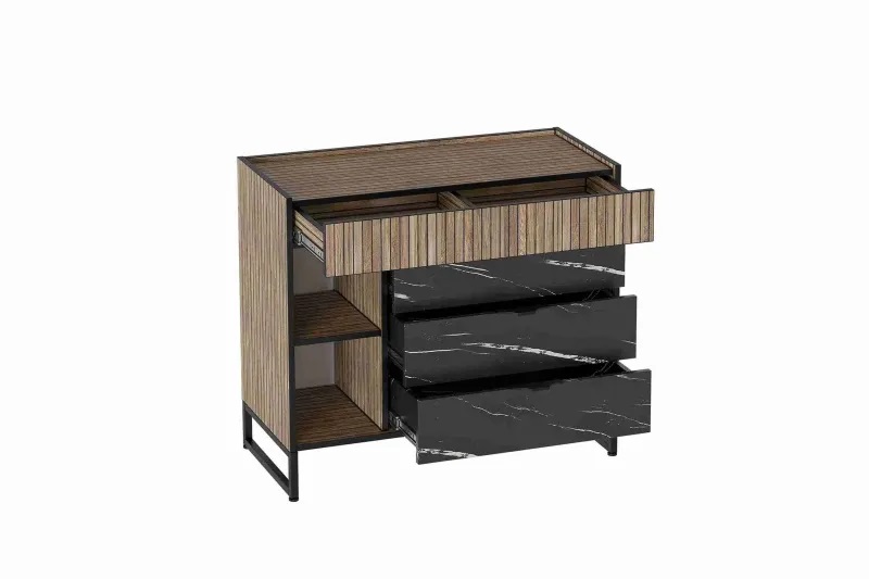 Комод Бьянка выполнен из (ЛДСП) в комбинации Дуб Гринвич / Мрамор неро.