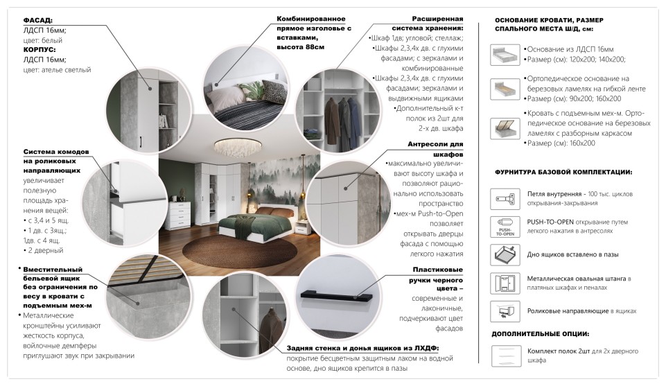 Чикаго - это гибкая и многогранная система, позволяющая подобрать уникальное сочетание модулей для любого интерьера от компактной квартиры до просторного дома. Минималистичный дизайн и нейтральные цветовые решения делают пространство более ярким и воздушным, позволяют системе сочетается с другими цветами и материалами в интерьере. Комод с прочными ручками и кровать с оригинальным комбинированным изголовьем добавляют элегантности и индивидуальности. Антресоли увеличивают общую площадь хранения, делая пространство более аккуратным и упорядоченным.