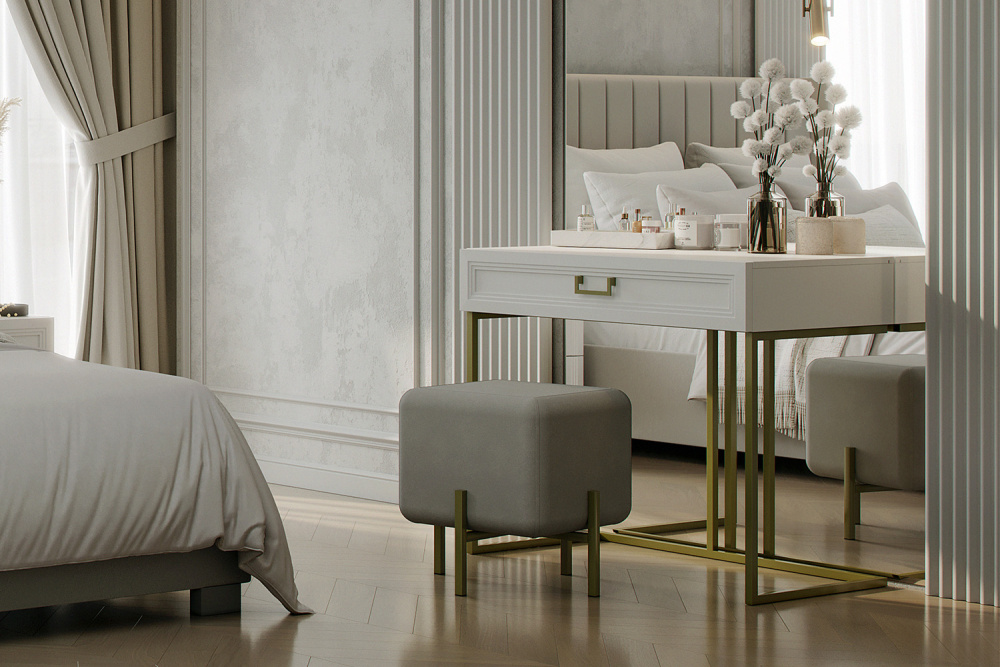 Основу дизайна составляет геометрический символ — квадрат. Это видно по золотым матовым ручкам на тумбе и столе;