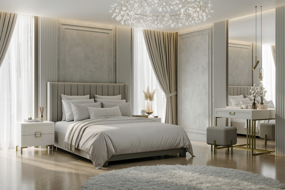 Спальня Дольче выполнена в стиле эклектики, а также соединяет в себе стиль ар-деко в современном прочтении и минимализм. К строгим формам и безупречной геометрии добавлена гладкая текстура, позволяющая смягчить декор и подарить коллекции шлейф тонкой роскоши с золотыми вставками;