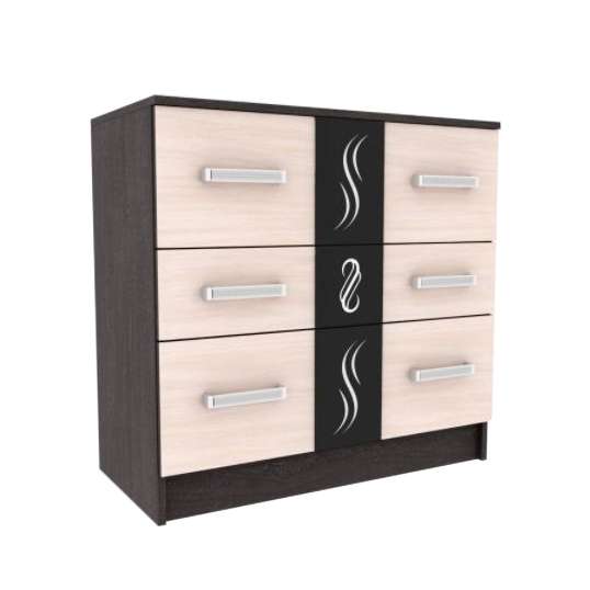 Фасады комода украшены эффектными накладками из стекла с зеркальным рисунком, нанесенным методом «Шелкография».