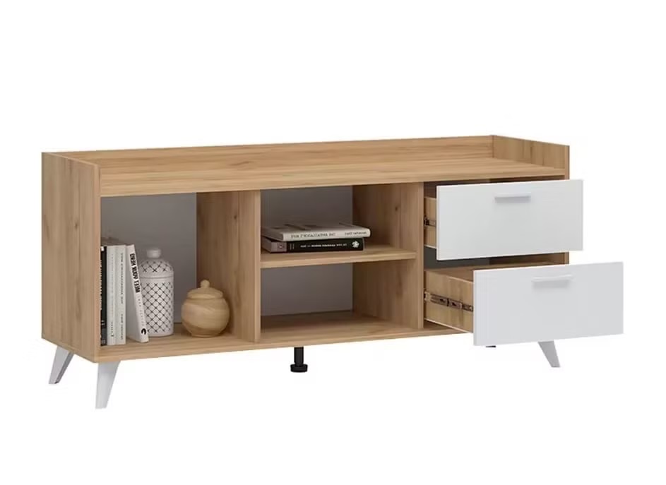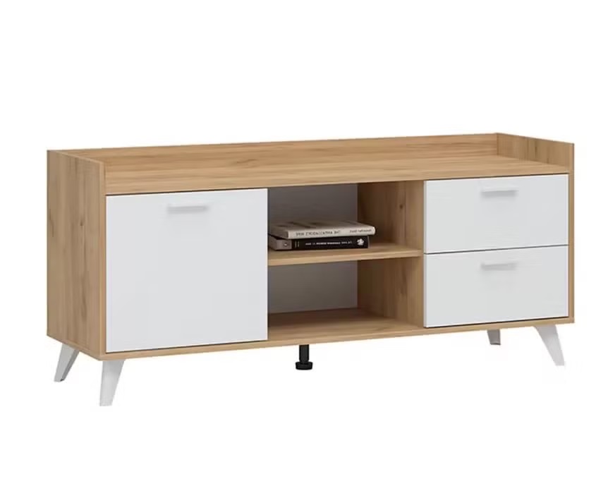 Тумба под ТВ Ирис ТБ-02 стильное решение для современного интерьера. Белоснежный фасад с корпусом древесного оттенка создаёт интересное сочетание.