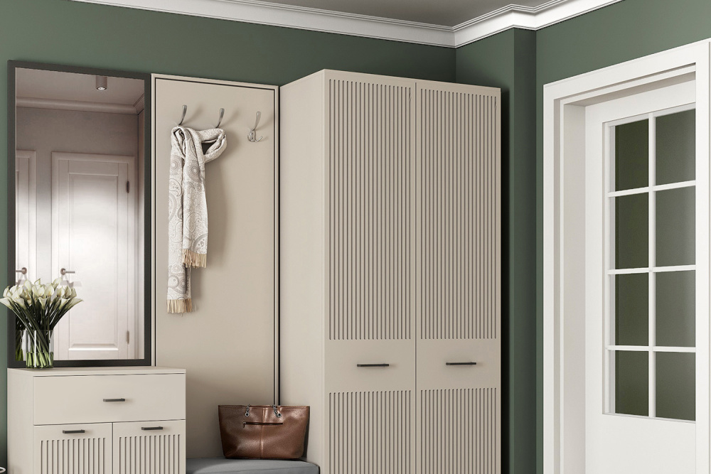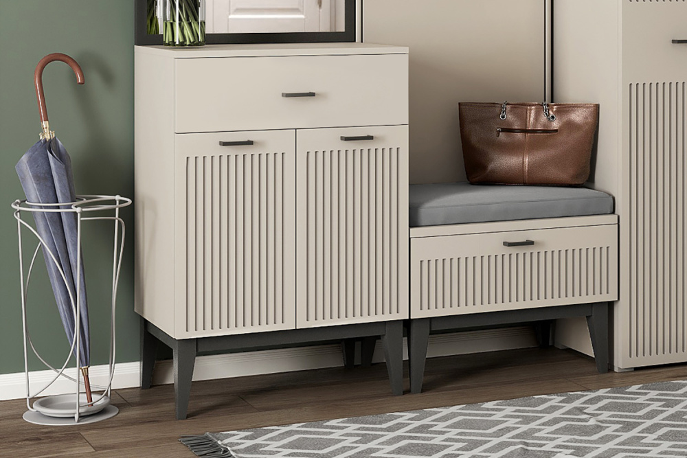 Фасады: МДФ с фрезеровкой и без (панель ящика тумбы), окутаны плёнкой ПВХ;