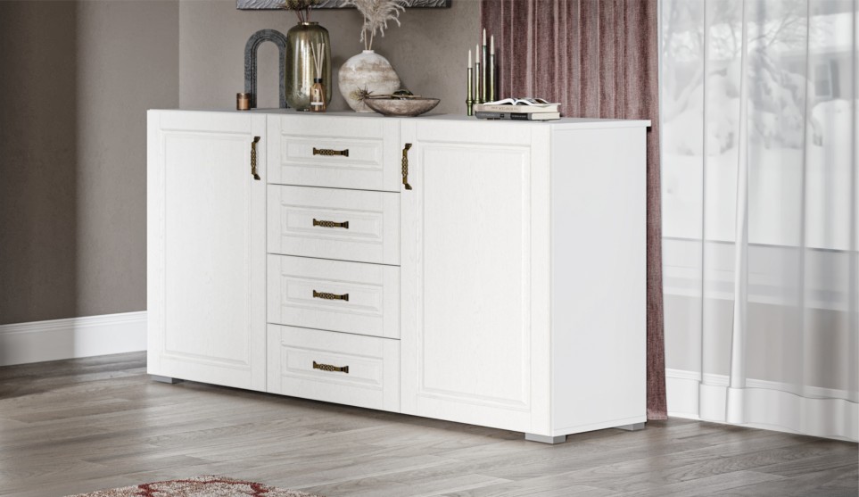 Вместительный и функциональный комод Лацио с двумя отделениями по бокам и четырьмя выдвижными ящиками по центру создаст уютную атмосферу в интерьере гостиной или спальни. Белые фрезерованные фасады из МДФ с рисунком и текстурой дерева наполняют комнату светом, делают ее просторнее. Оригинальные металлические ручки придают комоду изысканность. В ящиках на телескопических направляющих удобно хранить одежду и личные вещи, а в закрытых отделениях – посуду или текстиль. Выполнен из экологичных материалов
