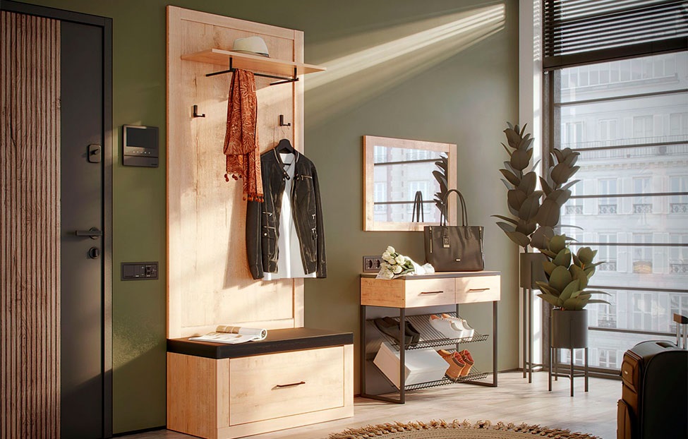 • Настенная панель с полкой, тремя крючками и П-образной вешалкой. В комплекте есть крепления для навески на стену;