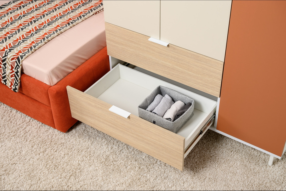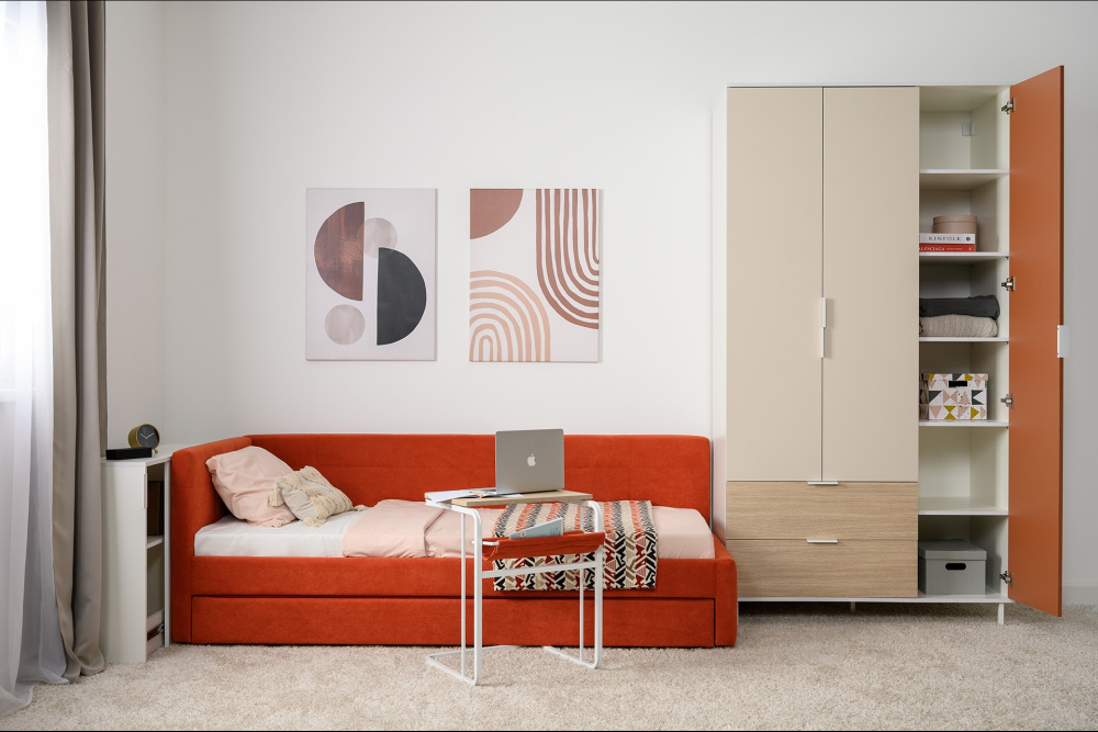 Все вещи ребёнка будут на своём месте. На столе есть крепление для рюкзака или наушников. Наполнение шкафов для одежды можно менять на выбор: полки либо штанги. Петли фасадов оснащены доводчиками.