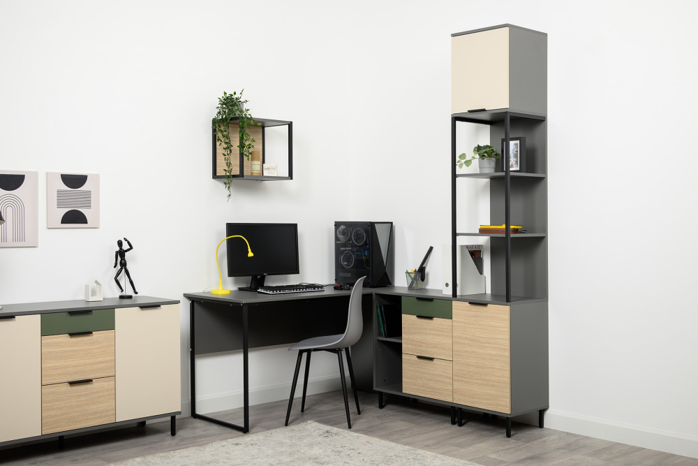 Все вещи ребёнка будут на своём месте. На столе есть крепление для рюкзака или наушников. Наполнение шкафов для одежды можно менять на выбор: полки либо штанги. Петли фасадов оснащены доводчиками.