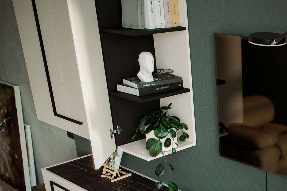 Кромочный материал: ПВХ толщиной 0,4 и 2 мм на видимых торцах щитовых деталей, меламиновый — на невидимых;