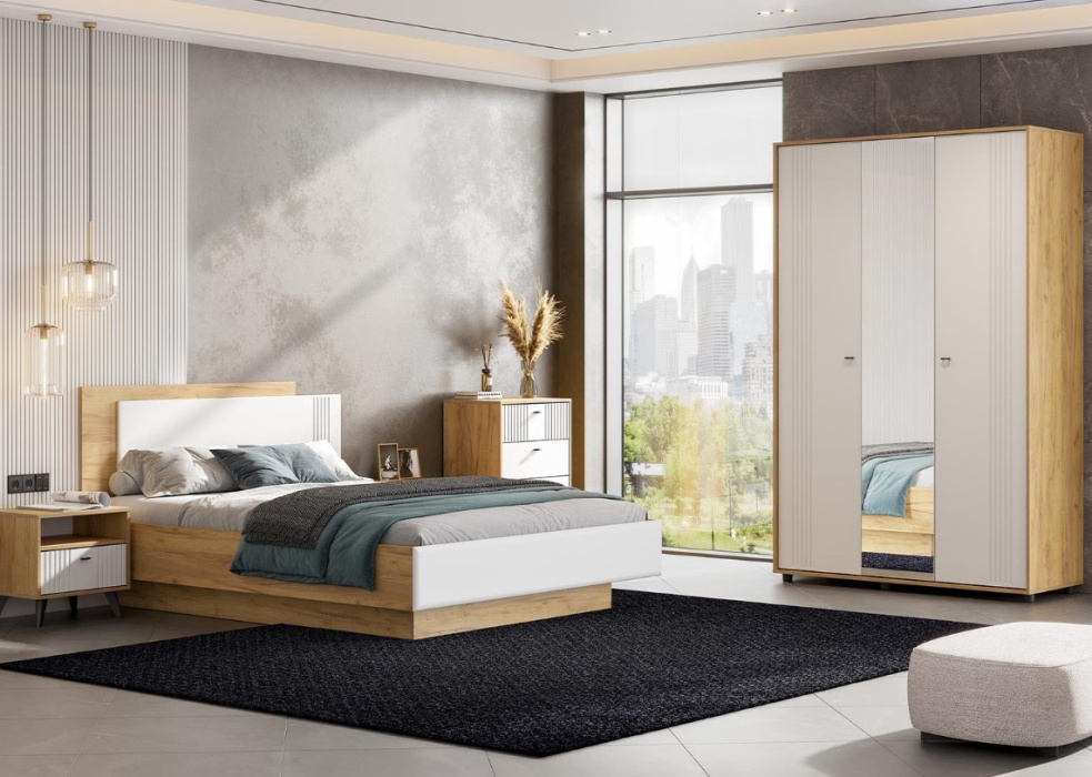 Модульная спальня «Милан» — это очень стильное решение. Она выполнена из качественных материалов — ЛДСП в цвете Дуб Золотой и Белого матового МДФ, что гарантирует долговечность и прочность. Фасады имеют качественную и красивую фрезеровку, которая придаёт спальне изысканность и элегантность.