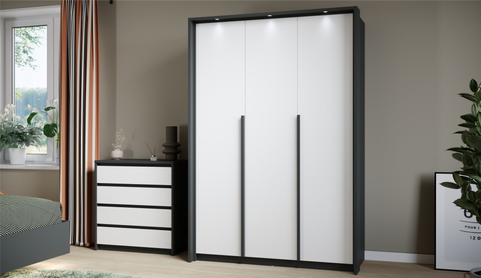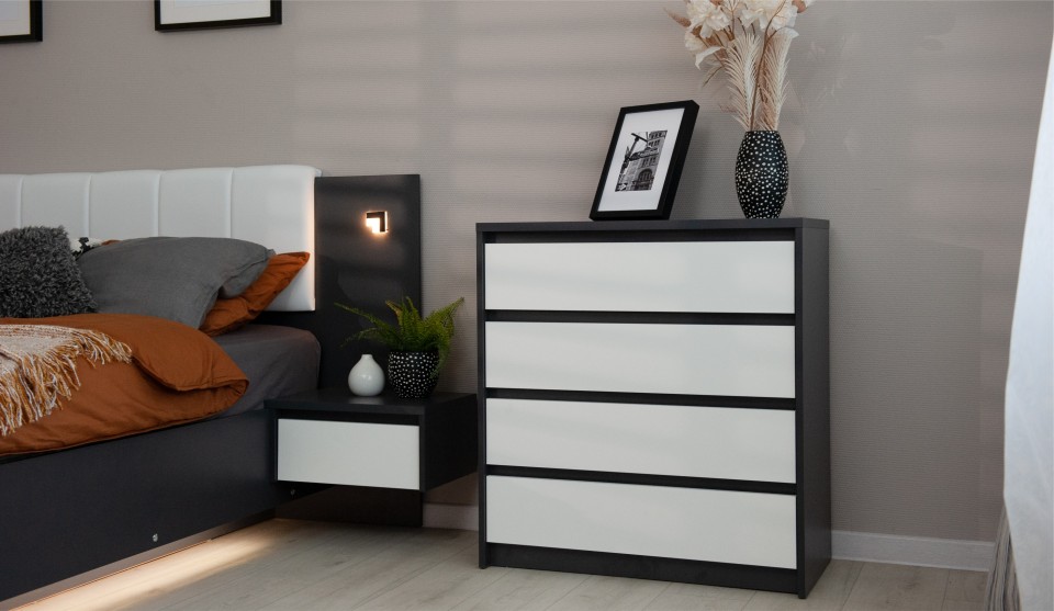 Мишель – это современная спальня с лаконичными формами и строгой геометрией в актуальных природных цветах. Оригинальная конструкция основания в сочетании со светодиодной подсветкой создают «эффект парения». Накладные светильники в комбинированном изголовье дают дополнительное освещение в ночное время, а мягкая накладка с вертикальной отстрочкой поддержит спину во время отдыха. Отсутствие лицевой фурнитуры в ящиках и комодах подчеркивают минималистичный дизайн спальни, а контрастные ручки шкафов оттеняют белизну фасадов.