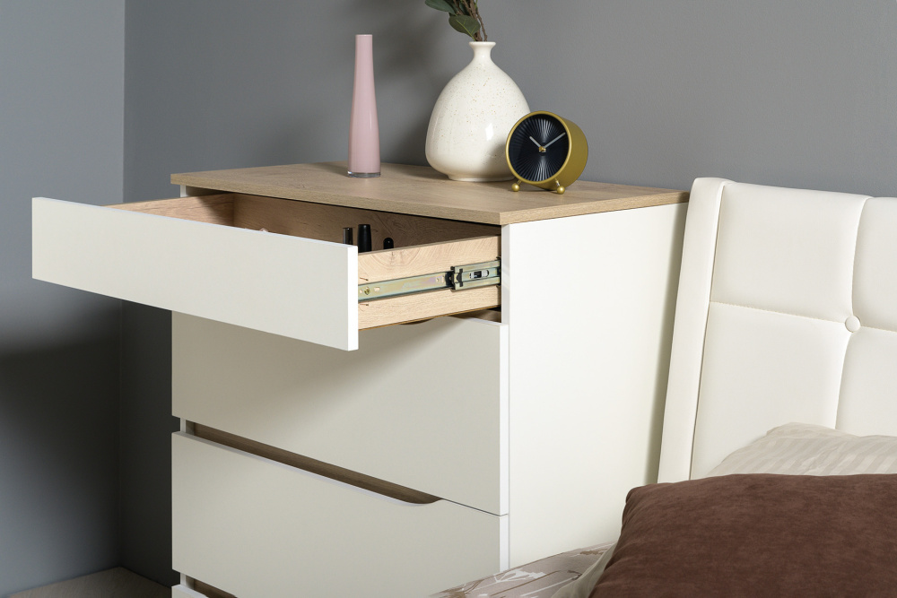 Лицевую фурнитуру заменяет стильный вырез, открывающий древесный декор корпуса.