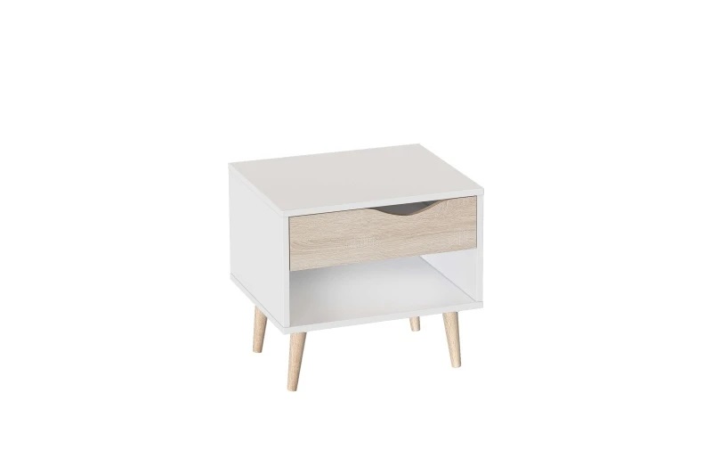 Тумба прикроватная «Соната» с непроходными боковыми стенками, между которыми в верхней части расположен ящик на шариковых направляющих, с фасадом, декорированным вырезной ручкой в цвете «Дуб Сонома», а в нижней — открытая ниша для хранения.