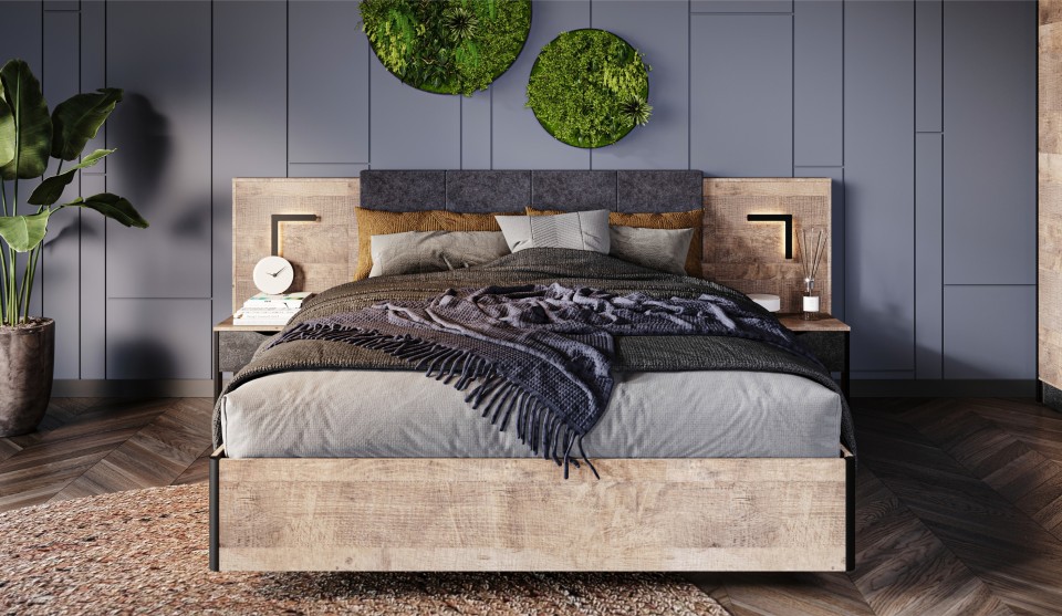 Спальня "Стокгольм" - это современная функциональная система, которая станет главным украшением лофтового интерьера. Особенность дизайна - это сочетание реалистичных по цвету и тактильности трендовых декоров, которые соответствуют последним городским тенденциям. "Дуб Гранж" привлекает имитацией вручную обработанного дерева с выразительной зернистой текстурой, характерной формой досок. Стильный серый цвет "Железного камня" с металлическими разводами и новая текстура состаренной штукатурки в сочетании с гладкостью металла вносят индустриальный колорит. Оригинальные ножки-опоры из контрастного профиля МДФ, расположенные по бокам модулей, имитируют металл и подчеркивают стиль коллекции. Кровать выполнена в простых и лаконичных формах, мягкая накладка с вертикальной прострочкой комфортно поддерживает спину во время отдыха. Скрытые опоры основания придают эффект парения, создают завораживающий футуристический интерьер.