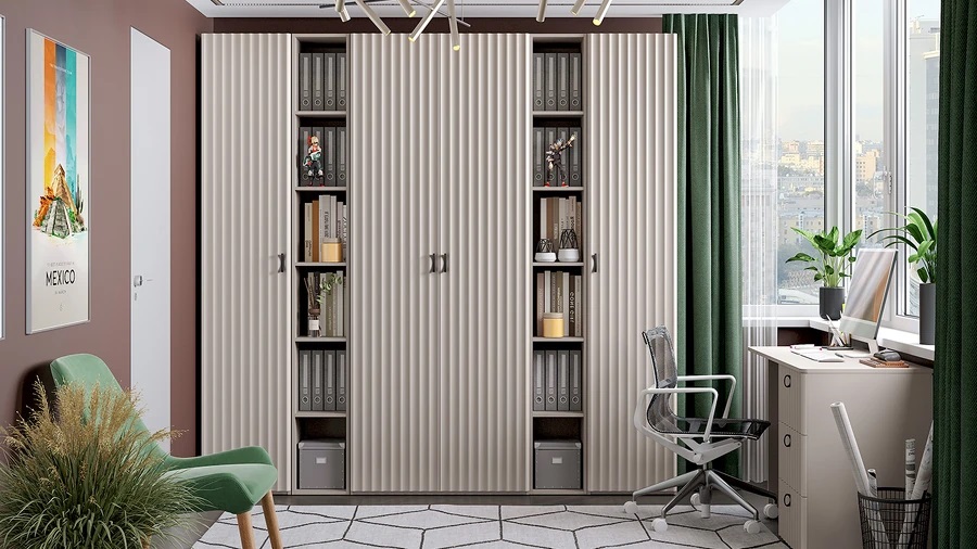 Фасады МДФ с оригинальной волнообразной фрезеровкой, придают мебели динамичность и уникальность. Специальная пленка soft-touch создает бархатистую поверхность, которая радует тактильными ощущениями при каждом взаимодействии. Элегантные линии и проработанные детали создают атмосферу изысканности, идеально соответствуя актуальным трендам в дизайне интерьеров. Фрезеровка столешницы имитирует фрезеровку фасадов, обеспечивая безопасность ребёнка благодаря отсутствию острых углов.