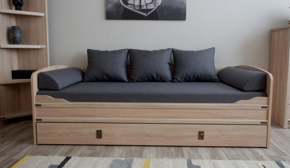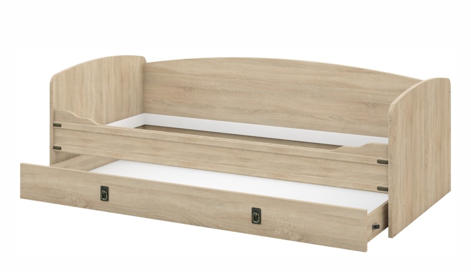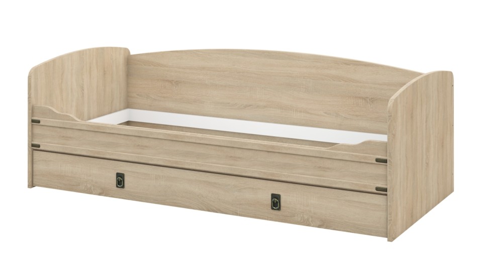 Кровать-топчан – со скругленным изголовьем и высокой спинкой имеет дополнительное спальное место, с помощью множества роликов его легко выдвинуть, можно использовать как ящик для белья. Мягкая кромка 2мм защищает края кровати от повреждений и сколов. Украшением служат стилизованные металлические ручки MARINE бронзового цвета и декоративные элементы в тон. В комплекте с декоративным матрасом и подушками превращается в молодежный диван. Пользоваться кроватью может взрослый и ребенок любого возраста, так как она имеет размеры стандартной кровати 90х200см, устойчивую конструкцию и нейтральный для интерьера цвет. Идеально компонуется со всеми модулями системы Валенсия.
