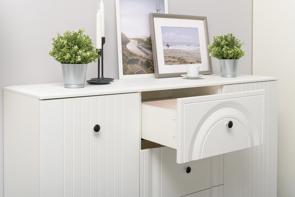 Функциональный комод Валенсия станет удачным дополнением системы хранения и поможет поддерживать в комнате порядок. Модель оснащена просторными нишами и выдвижными ящиками, поэтому для каждой вещи найдется свое место. Благодаря стильной фрезеровке и контрастной фурнитуре комод смотрится особенно привлекательно.