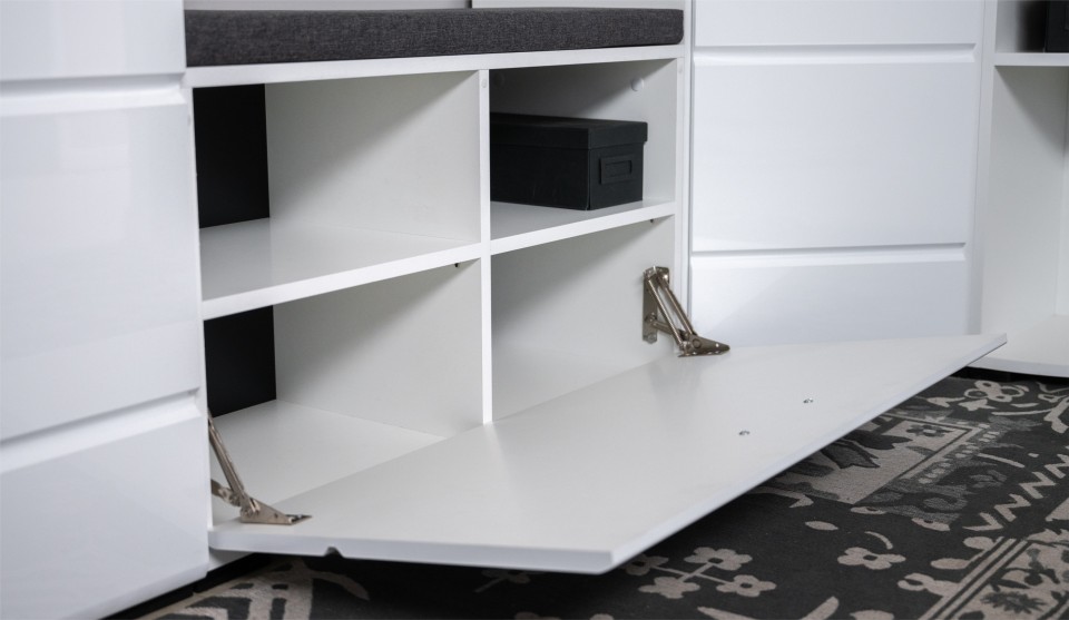 Прихожая Йорк выполнена в современном стиле – сочетает в себе функциональность и эффектный внешний вид: строгая горизонтальная фрезеровка фасадов, контрастные черного цвета ручки и задняя стенка из ХДФ. Глянцевые белые фасады High Gloss из МДФ и зеркала наполняют помещение светом, делают ее ярче и просторнее. Компактная и вместительная, с небольшой глубиной модулей, она поможет правильно организовать систему хранения даже в небольшом помещении.