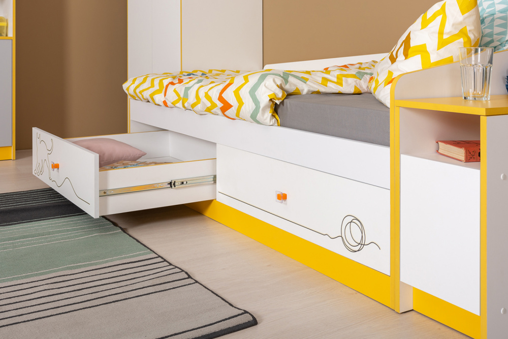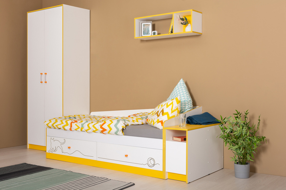 Детская кровать Альфа прекрасно впишется в интерьер. Выдвижные ящики позволяют рационально использовать пространство для хранения постельных принадлежностей, игрушек или других вещей. Изображение играющего котенка создает уютную и непринужденную атмосферу.