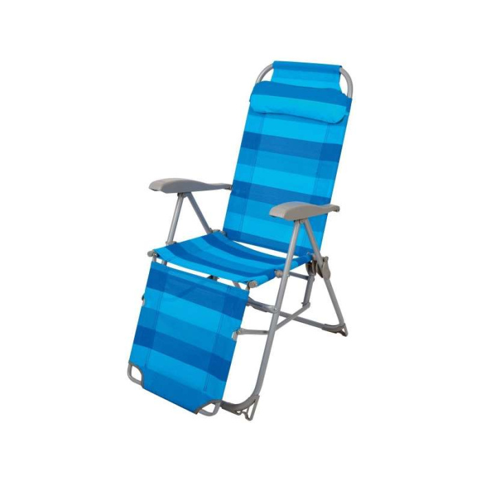 Кресло-шезлонг предназначено для для отдыха сидя и полулежа на открытом воздухе и в помещении. Имеет подножку, меняющую положение в зависимости от положения спинки. Восемь положений спинки. Эргономичные подлокотники. Регулировка подушки-подголовника. Ткань чехла не боится воды, легко чистится моющими средствами и устойчива к загрязнениям. Удобное в обращении. В сложенном виде занимает минимум места.