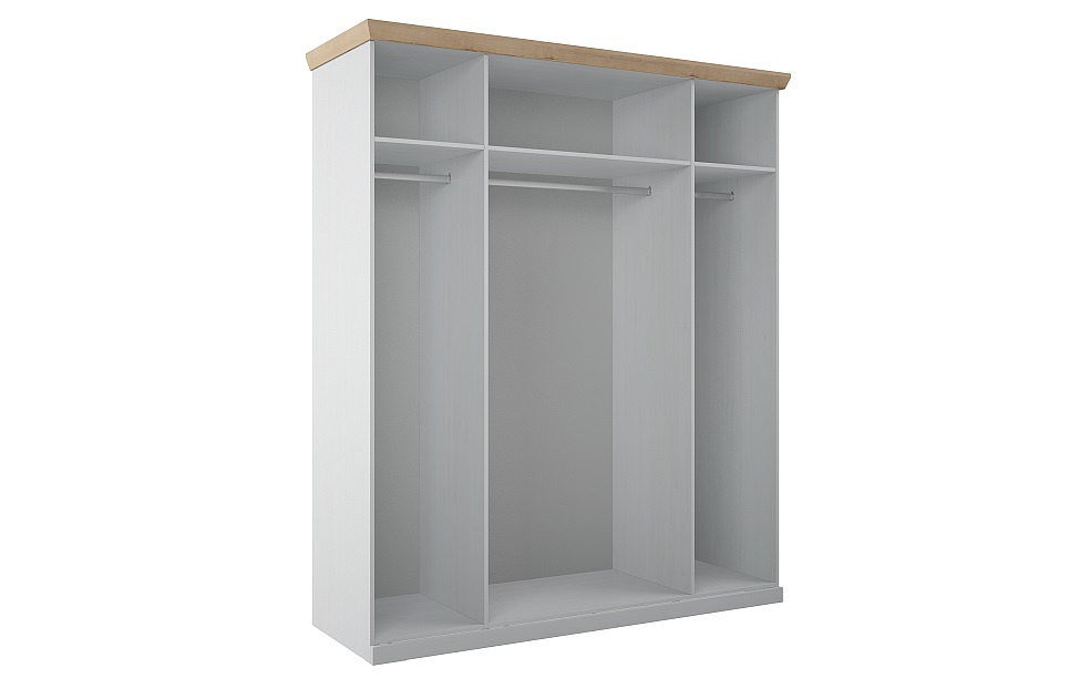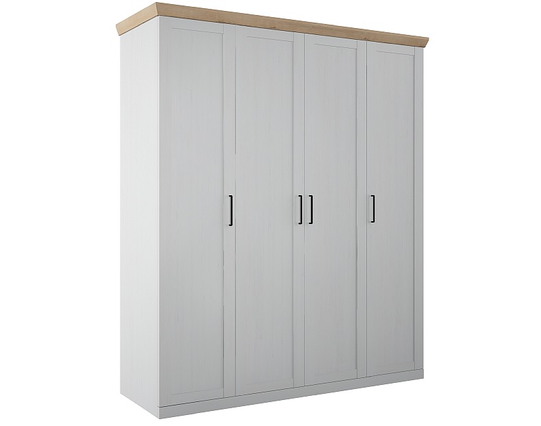 Вместительная модель с покрытием цвета «блан-шене» станет настоящим подарком для тех, кто давно мечтает о своей гардеробной. Платяной шкаф подойдет для минималистичной спальни или гостиной в современном оформлении. Изящный скошенный карниз в оттенке «дуб бунратти», лаконичные филенки и тонкие ручки-скобы, стилизованные под «античное железо черное», делают внешний облик мебели аккуратным и завершенным. Опорная часть замаскирована цоколем, выполненным в основном тоне.