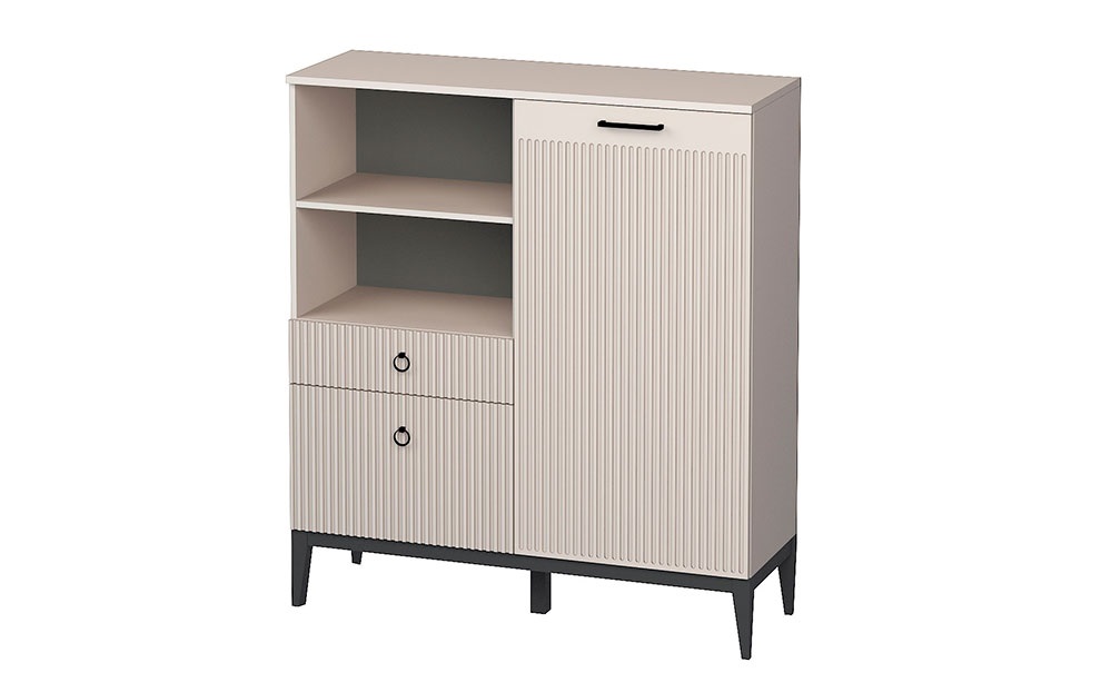 • Наполнение шкафа: полка в открытой части, три полки за высоким фасадом и 2 ящика (малый и большой).