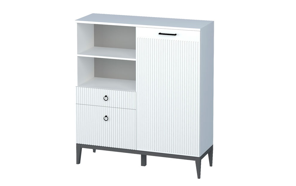 • Наполнение шкафа: полка в открытой части, три полки за высоким фасадом и 2 ящика (малый и большой).
