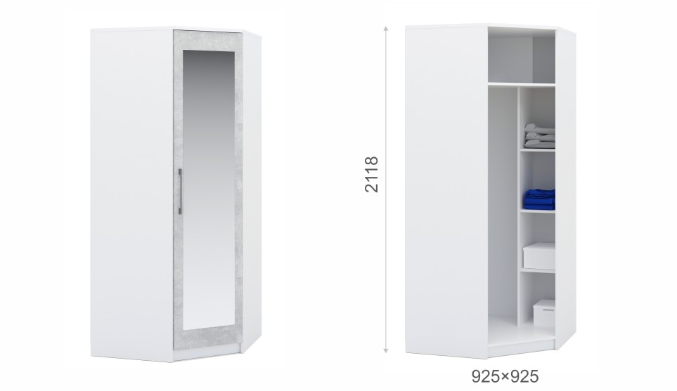 Угловой шкаф выполнен в стиле минимализм – строгие линии, идеальные пропорции, отсутствие декора. Все варианты цвета корпуса и фасадов подобраны в нейтральных сочетаниях, они универсальны для любого стиля интерьера, их можно сочетать со множеством ярких и насыщенных оттенков, а с помощью смены цветных текстиля и аксессуаров - полностью преображать пространство. Зеркало на фасаде визуально добавляет света и простора.