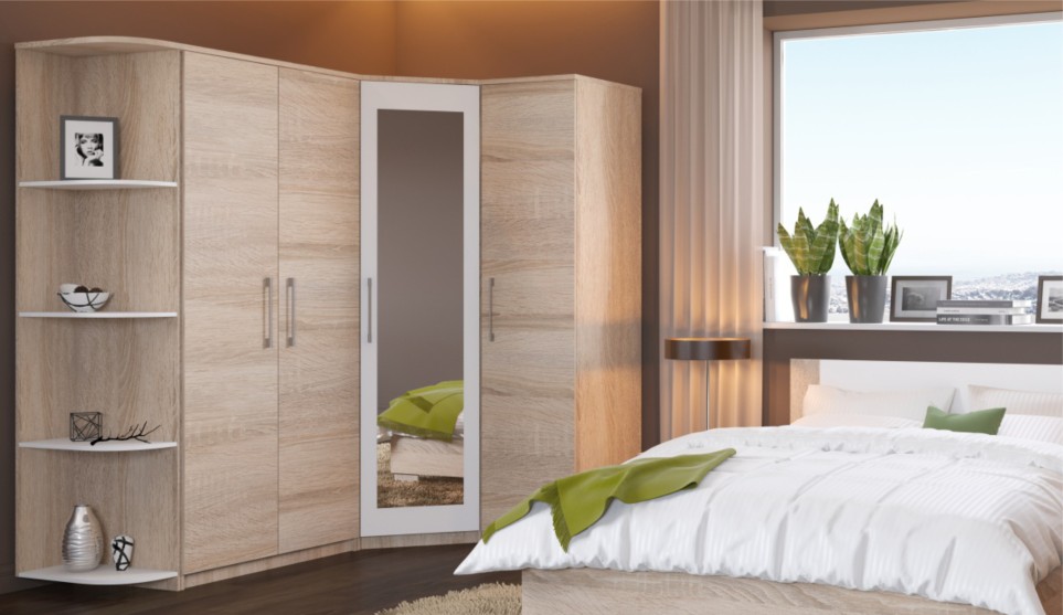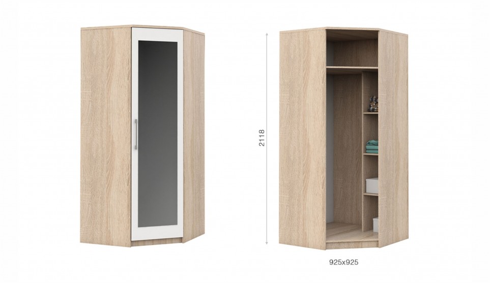 Угловой шкаф выполнен в стиле минимализм – строгие линии, идеальные пропорции, отсутствие декора. Все варианты цвета корпуса и фасадов подобраны в нейтральных сочетаниях, они универсальны для любого стиля интерьера, их можно сочетать со множеством ярких и насыщенных оттенков, а с помощью смены цветных текстиля и аксессуаров - полностью преображать пространство. Зеркало на фасаде визуально добавляет света и простора.