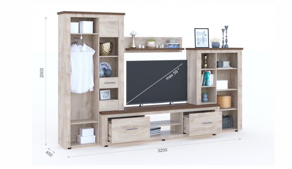 Стенка Мэдисон - это готовое решение для гостиной в современном европейском дизайне. Покрытие из ЭКОшпона повторяет фактуру и рисунок натурального дерева, устойчиво к износу. Крышки стенки, полки и ниша под телевизор выполнены из утолщенной плиты с мягкими безопасными краями. Мебель выполнена из экологически безопасных материалов.