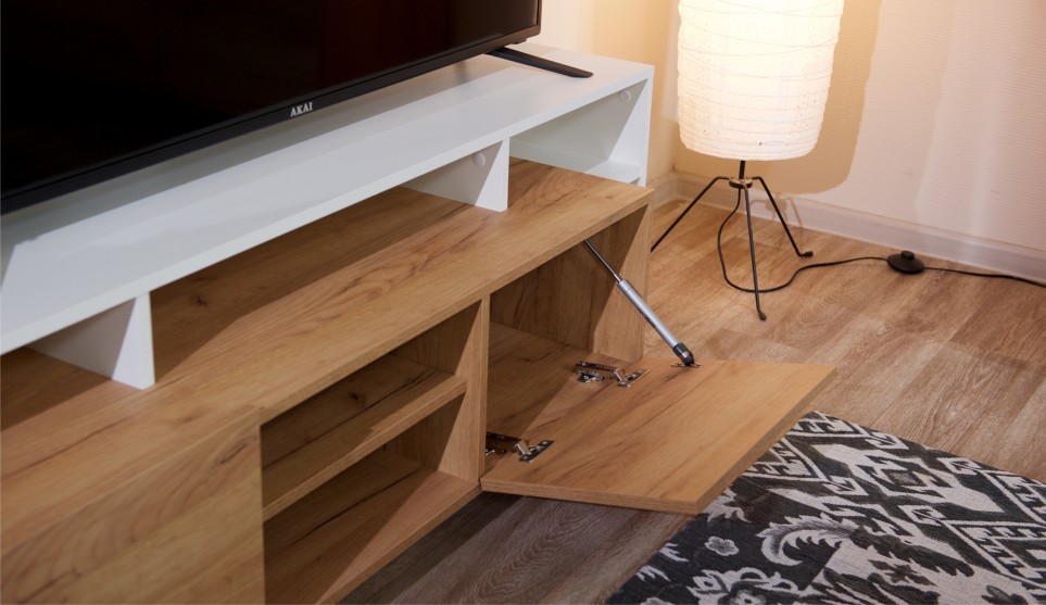 Стенка Невио-2 выполнена с использованием новейшего декора «Дуб крафт золотой» в сочетании с белым - подходит для стилистических направлений лофт, минимализм, скандинавский. Простые формы, естественные природные оттенки создают гармоничную и умиротворенную атмосферу гостиной. Четкая текстура дерева, белый цвет, отсутствие внешней фурнитуры, углубленный цоколь - создают визуальную легкость и компактность стенки. Фасады, выступающие на 1см поверх корпуса, заменяют ручки. Стенку дополняет вместительный комод с витриной. Мебель выполнена из высококачественных экологичных материалов.