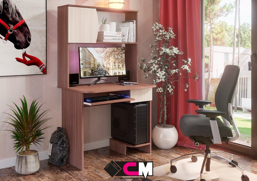 Стол компьютерный №2 Стендмебель станет основным элементом для обустройства достаточно комфортного рабочего места. Под столешницей находится выдвижная полка для клавиатуры, а также подставка для системного блока. Надстройка с полками пригодится для размещения аудио-колонок, познавательных книг и различных декоративных предметов, которые будут вас радовать. Небольшой выдвижной ящик создан для хранения канцелярских и прочих необходимых принадлежностей.