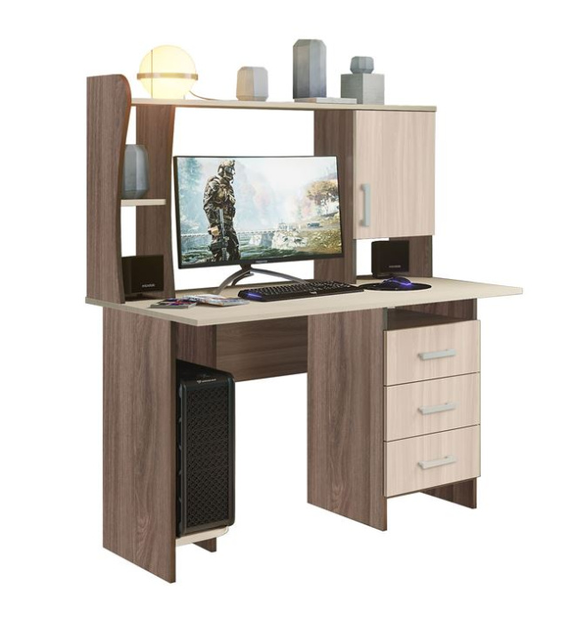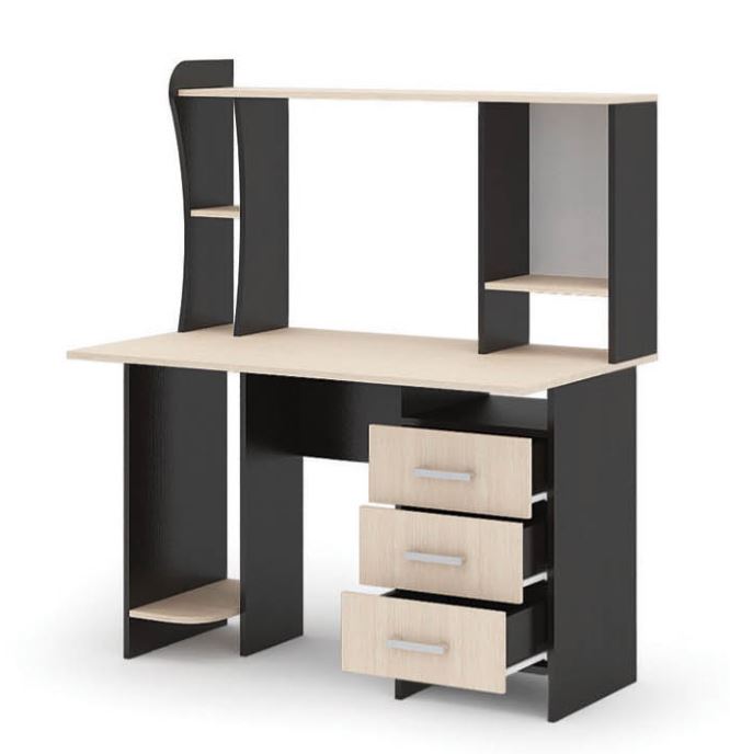 Стол компьютерный №5 Стендмебель станет основным элементом для обустройства достаточно комфортного рабочего места. Под столешницей находится специальный отсек для системного блока. Надстройка и небольшие полочки пригодятся для размещения аудио-колонок и различных декоративных предметов, которые будут вас радовать. Три вместительных выдвижных ящика созданы для хранения канцелярских и прочих необходимых принадлежностей.