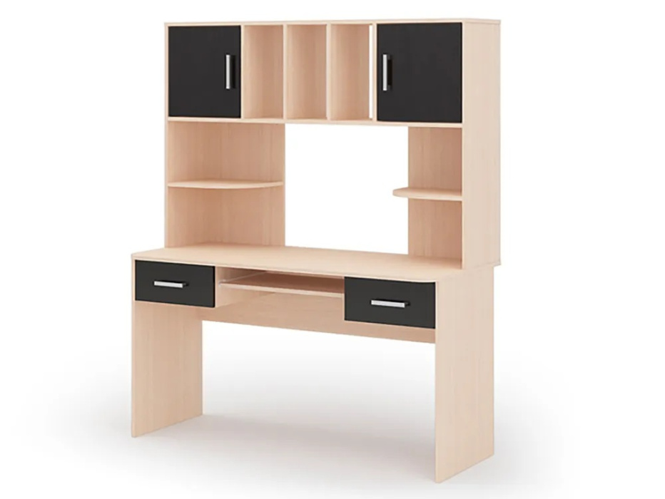 Стол компьютерный №8 Стендмебель станет основным элементом для обустройства достаточно комфортного рабочего места. Под столешницей находится выдвижная полка для клавиатуры. Надстройка и открытые полочки пригодятся для размещения аудио-колонок и различных декоративных предметов, которые будут вас радовать. Два вместительных выдвижных ящика и отделения с глухими дверцами созданы для хранения канцелярских и прочих необходимых принадлежностей.
